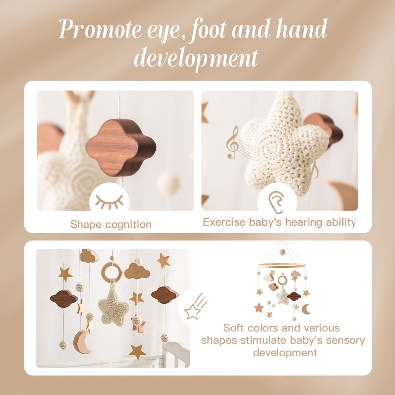 Dieses liebevoll gestaltete Baby-Mobile schafft eine ruhige, geborgene Atmosphäre und begleitet dein Baby sanft in den Schlaf. Die harmonisch aufeinander abgestimmten Formen – Sterne, Wolken, Monde und Kugeln – bewegen sich leicht in der Luft und fördern die visuelle Wahrnehmung sowie die sensorische Entwicklung deines Kindes.